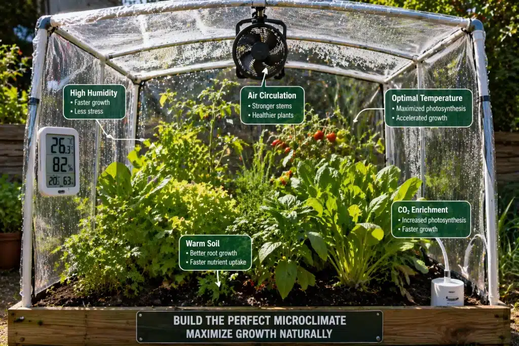 The enclosed document elaborates on this. A straightforward hoop house, which consists of PVC pipe bent into arches over an elevated bed and covered with three or six mil clear plastic sheeting, creates an enclosed air volume that warms more quickly than open ground, retains that heat for longer periods, and increases humidity around plants to lessen transpiration loss and water stress. As a result of the strong effect, plants inside a hoop house in early April are growing in conditions which would normally occur in mid-May in much of the UK and northern United States. Cloches, cold frames, and even recycled plastic bottles placed over individual seedlings work on the same principle: They create a localized, warm, humid environment that signals to the plant that conditions are favorable.