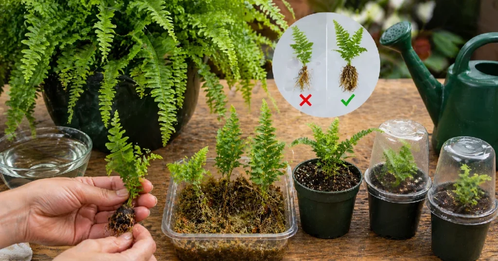 Newcomers are surprised by humidity. On the forest floor beneath the canopy of larger plants, Boston ferns developed in moist air. Due to the lack of roots in the newly divided section, the leaves are attempting to retain every drop of water. During the first week or two of a new division, cover it loosely with a clear plastic bag to create a humid microclimate. Despite being low-tech and somewhat awkward-looking, it performs better than the majority of complex propagation setups.